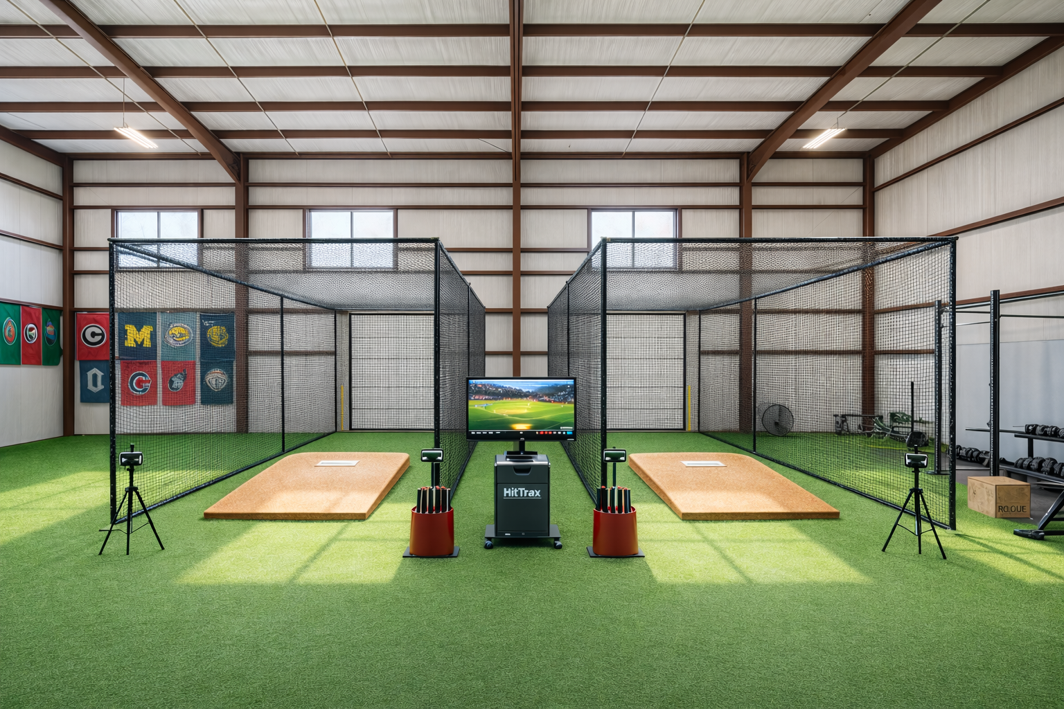 A top of the line hitting lab equipped with HitTrax technology and radar guns, providing real-time feedback on every swing. Athletes will see detailed metrics such as exit velocity, launch angle, distance, and spray charts, allowing them to track progress and make immediate adjustments.